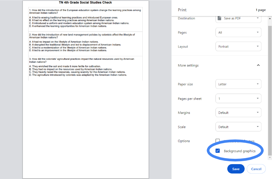 6. Before printing, ensure that the ‘Background Graphics’ option is selected under the ‘More Settings’ section.