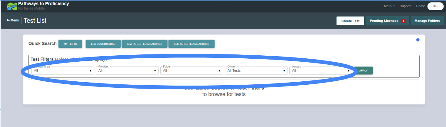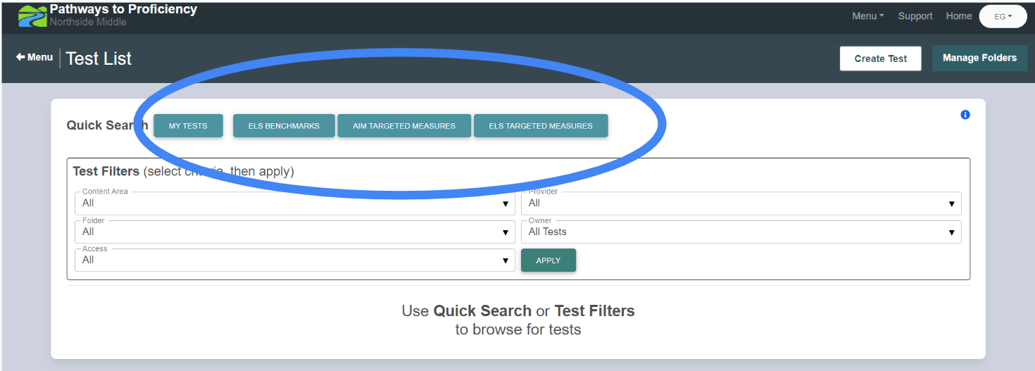 2. Navigate to Pathways to Proficiency -> Measures -> Tests.