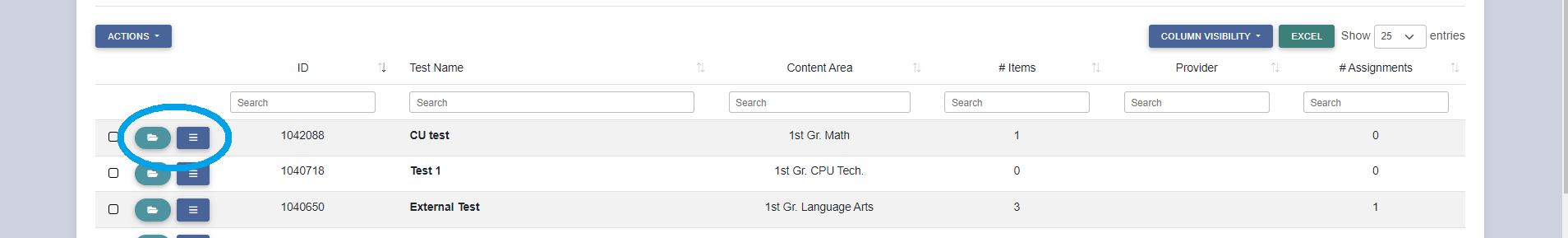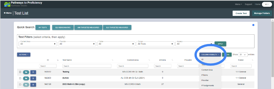 4. Once a search has been applied for tests, the test list can also be sorted by ID, number of items, provider, number of assignments, folder, access, level, type, or owner. Select which columns should be visible with the blue ‘column visibility’ drop down menu.