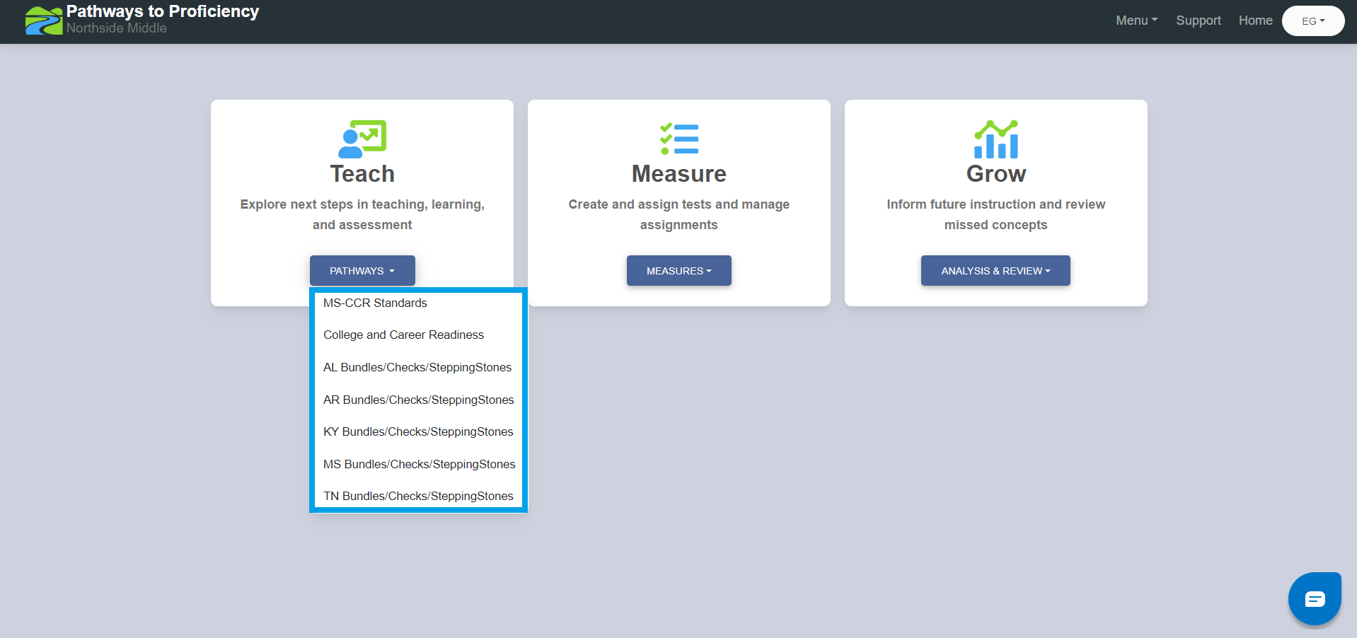 2. Navigate to Pathways to Proficiency -> Pathways, then choose Bundles/Checks/SteppingStones for your state from the drop down menu.