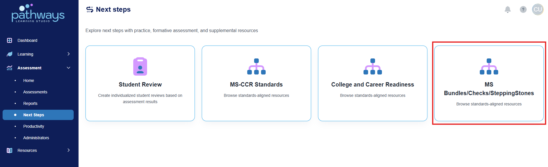 3. Navigate to 'Next Steps' on the left-hand navigation bar, then choose Bundles/Checks/SteppingStones for your state from the drop-down menu.