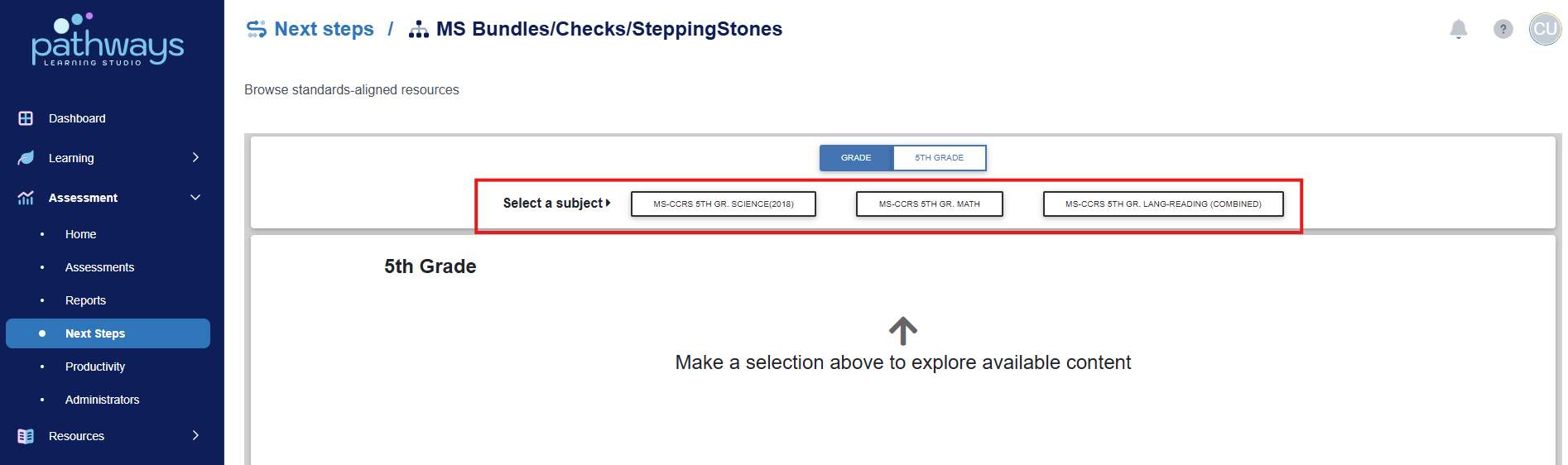 4. At the top of the screen, select the grade level for which you wish to view Pathways Powerchecks.
