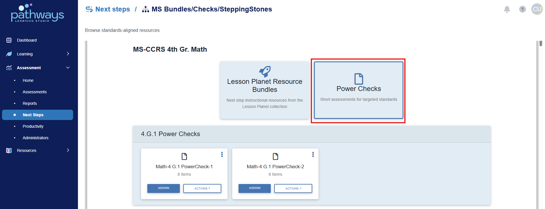 6. Navigate to 'Power Checks' to see a list of the power checks available for each standard in that subject area's grade level.