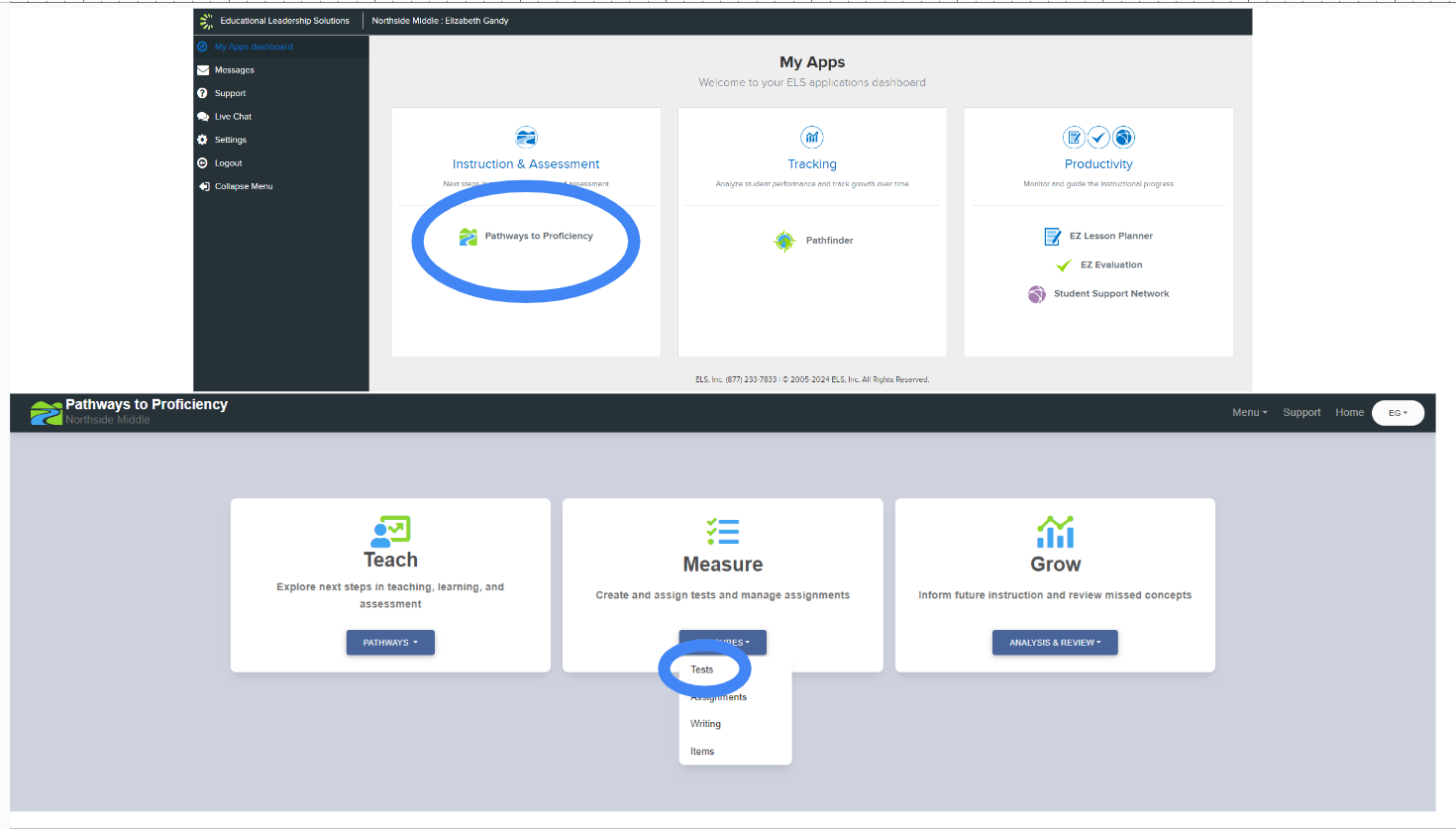 2. Navigate to Pathways to Proficiency -> Measures -> Tests -> Create a Test.