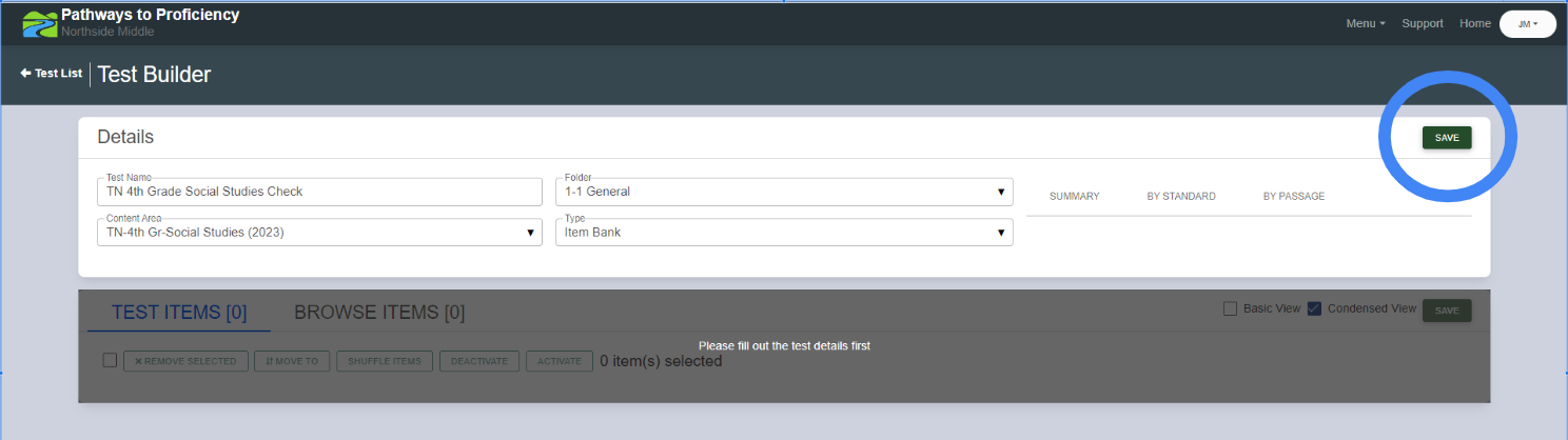 3. Input test name, choose test folder, select test content area, and choose 'Item Bank' for test type. Then, select 'Save.'