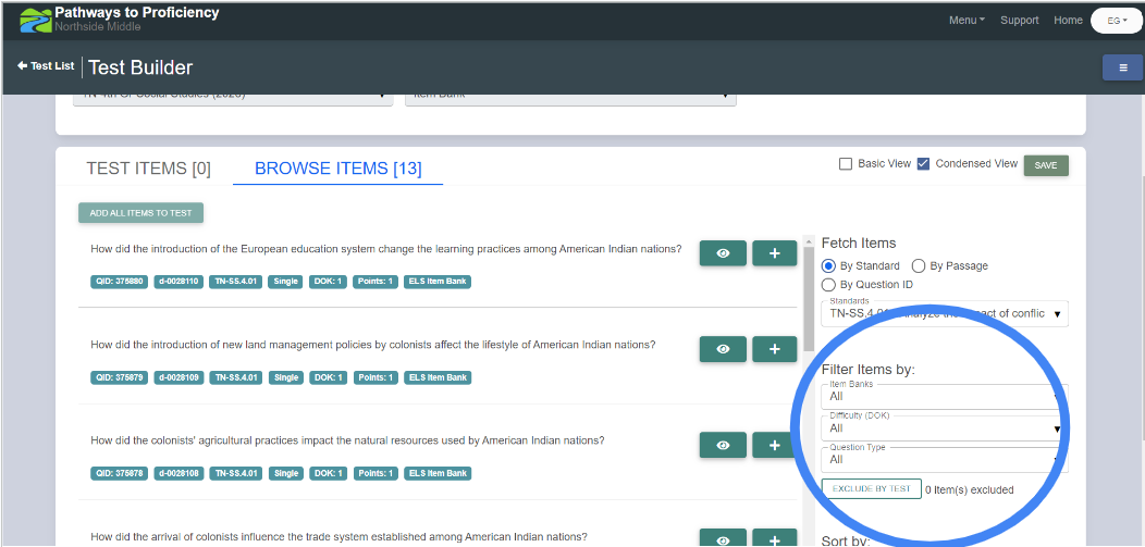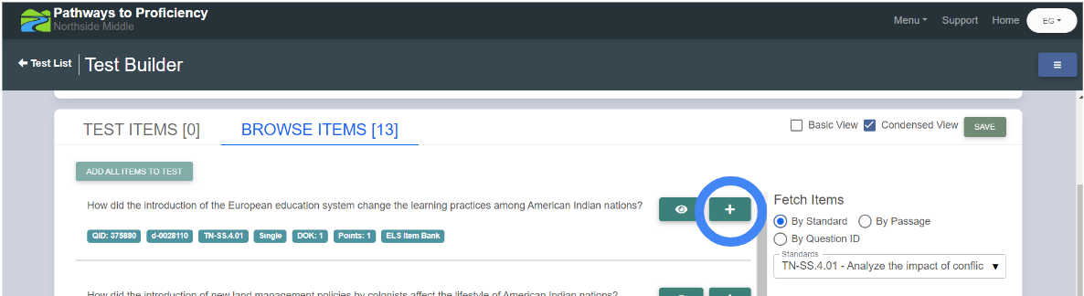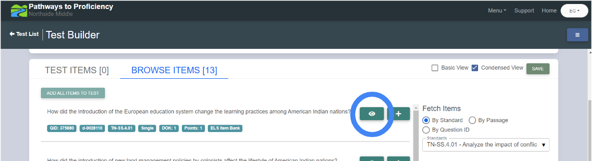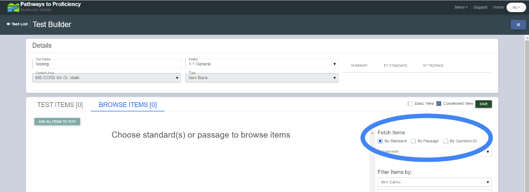 4. To add items to the test, choose 'By Standard', 'By Passage', or 'By Question ID' to filter the item search underneath 'Fetch Items.'