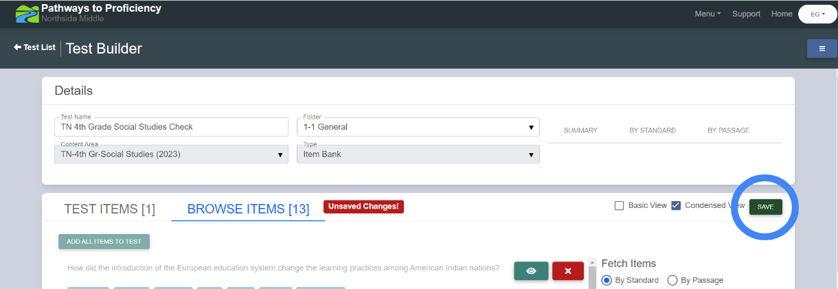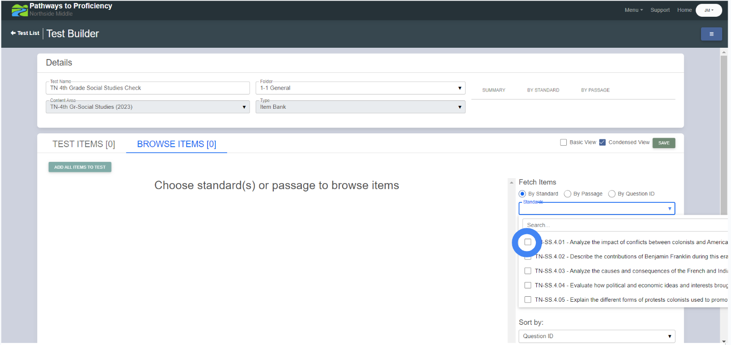 5. Choose the standard(s) or Passage(s) by selecting the boxes in the drop down menu under ‘Fetch Items’.