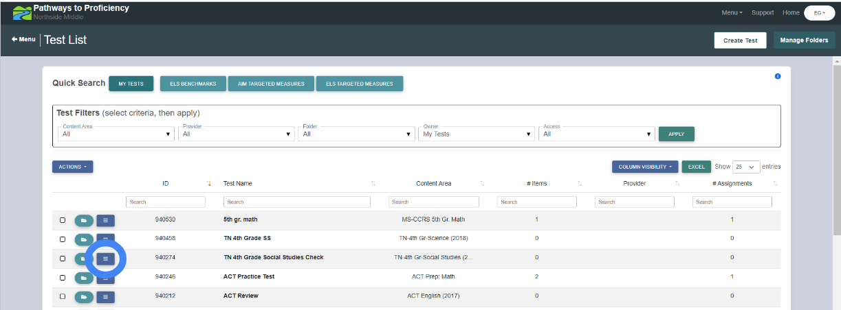 2. Navigate to Pathways to Proficiency -> Measures -> Tests.