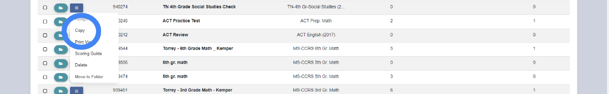 3. Locate the test you want to copy, then select the box with three lines to the left of the test ID and choose ‘Copy.'