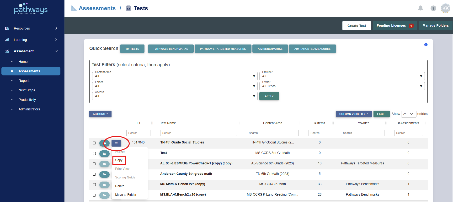 6. Locate the test you want to copy, then select the collapsed menu to the left of the test ID and choose ‘Copy.'