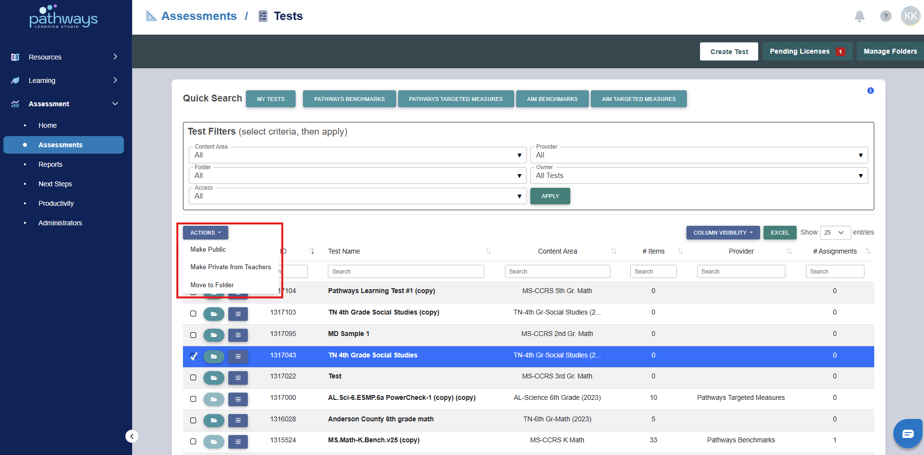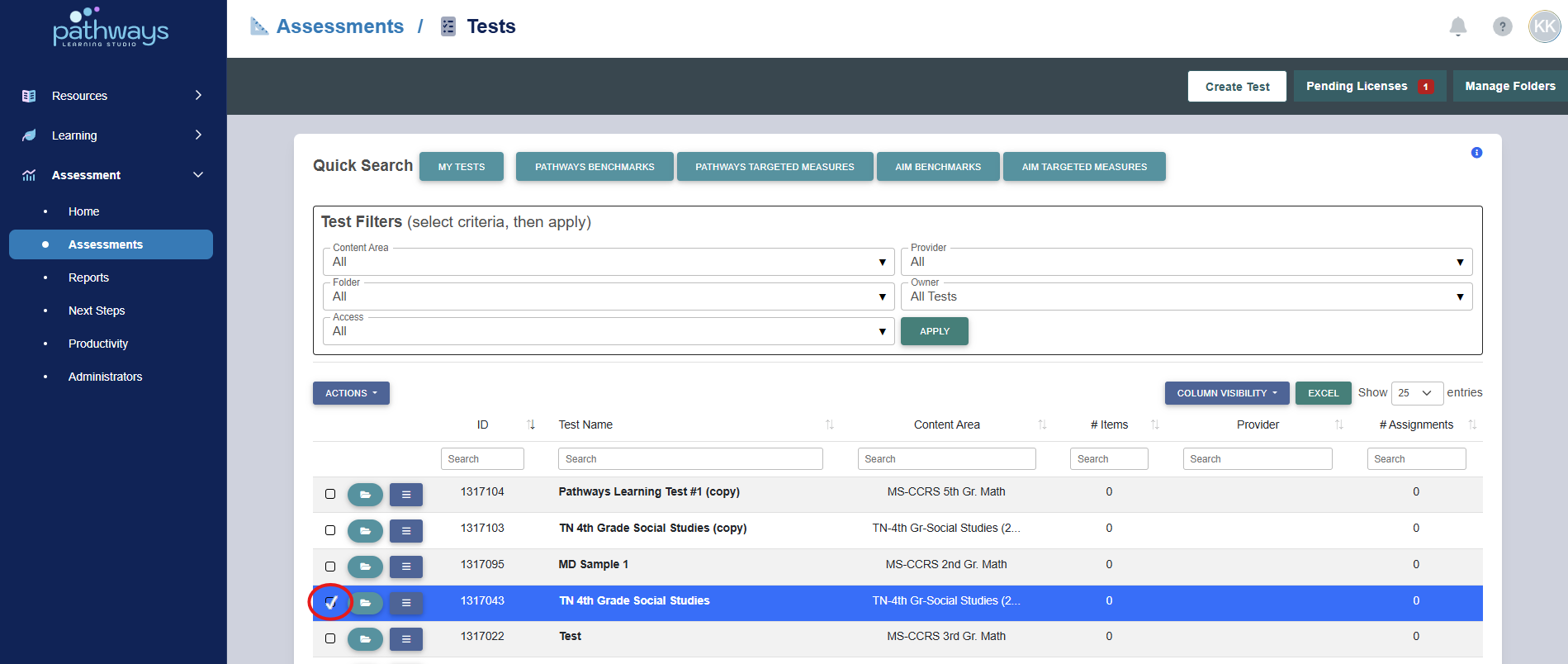 6. Locate the test for which you would like to set test permissions, and select the checkbox to the far left of the test ID.