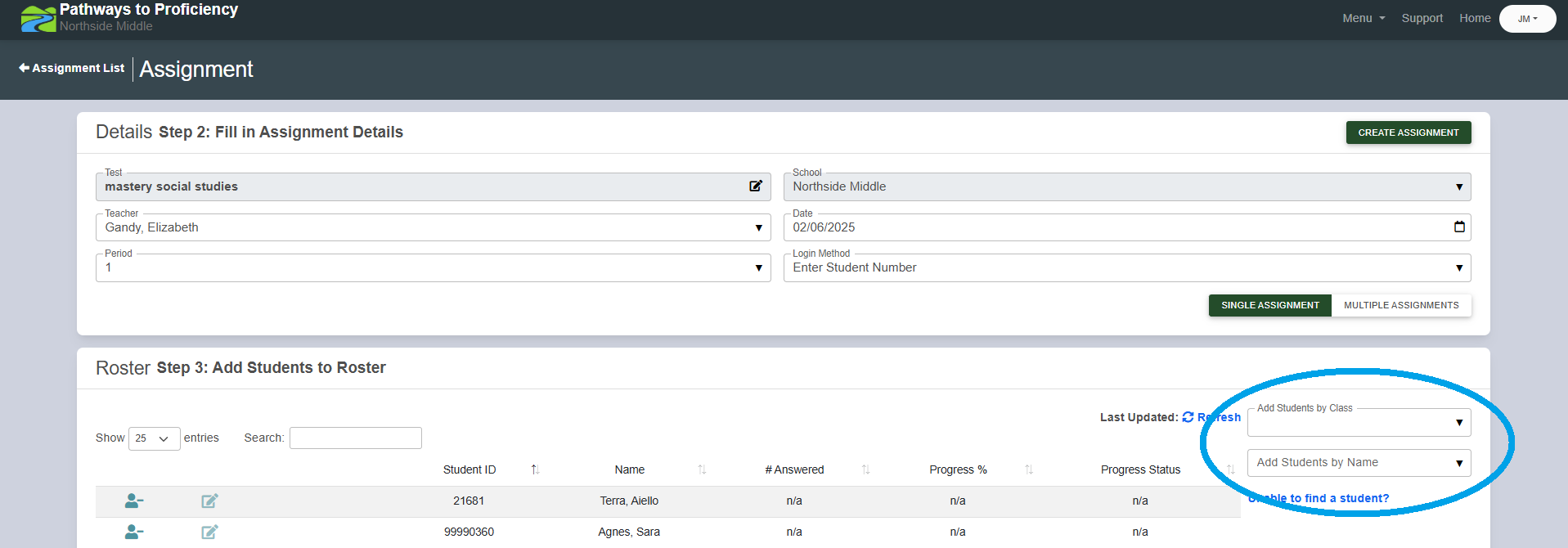 6. Add students by class or by name by selecting from the drop down menu at the right of the page.