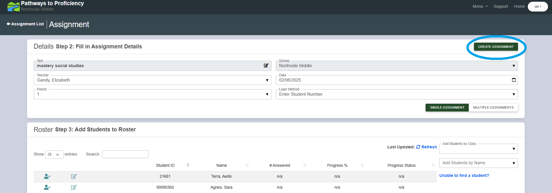 7. When all intended students have been added, press 'Create Assignment' at the top right corner of the page.