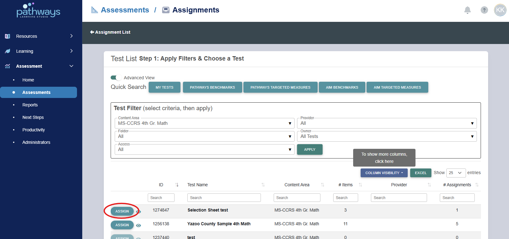 7. Locate the correct test, and select the ‘Assign’ button to the left of the assessment ID.