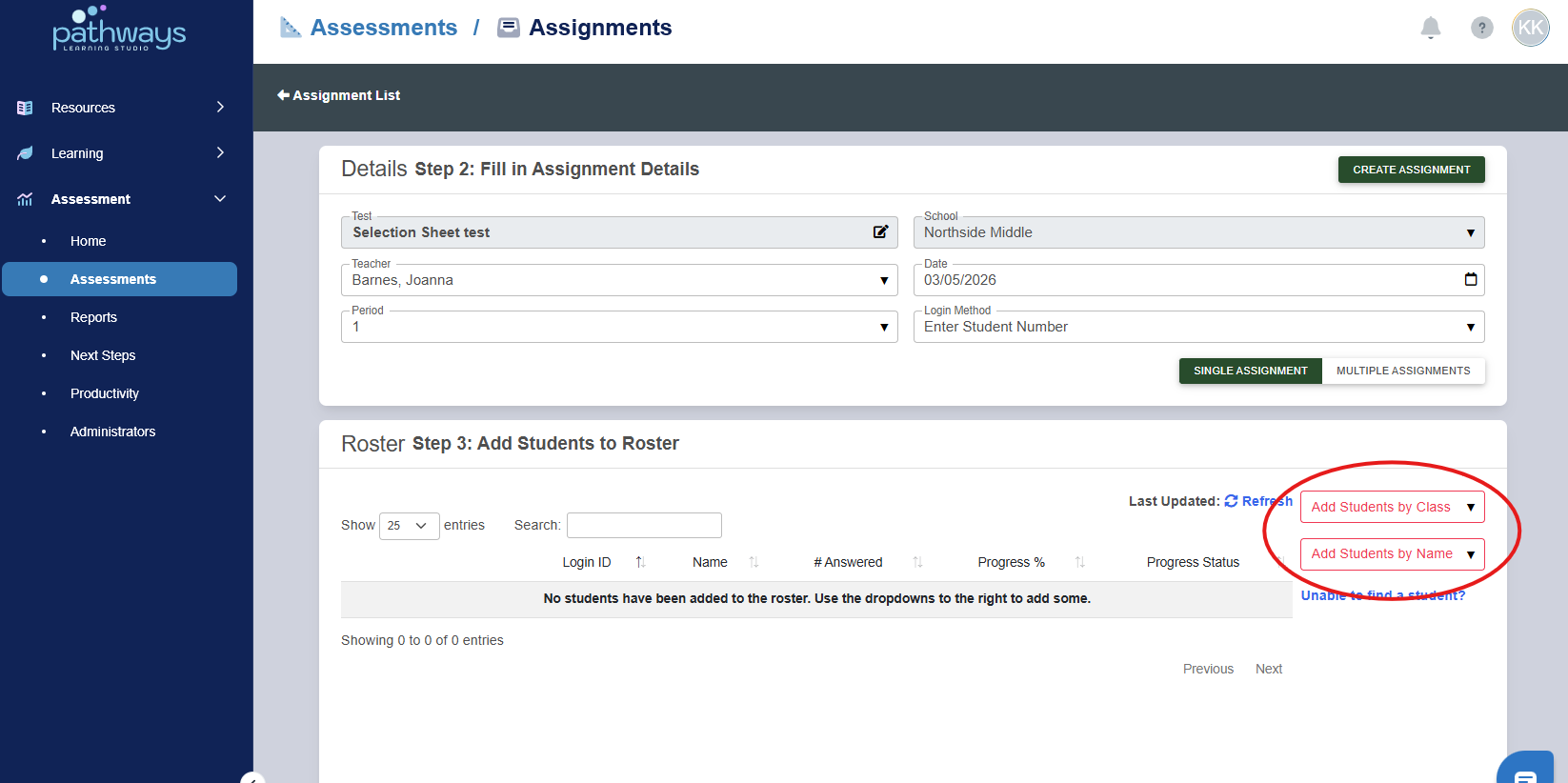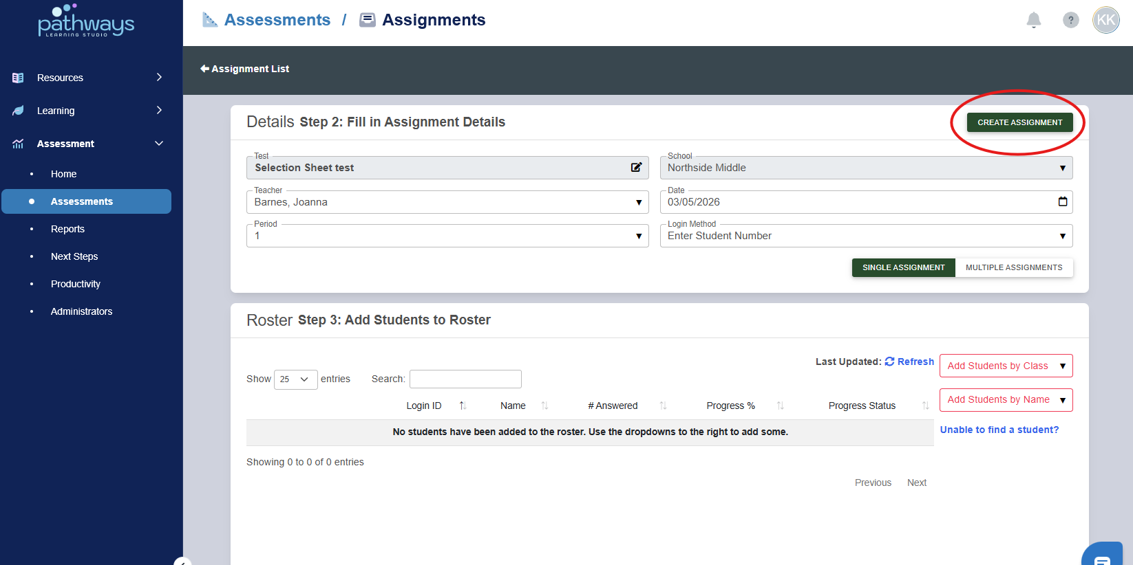 10. When all intended students have been added, press 'Create Assignment' at the top right corner of the page.
