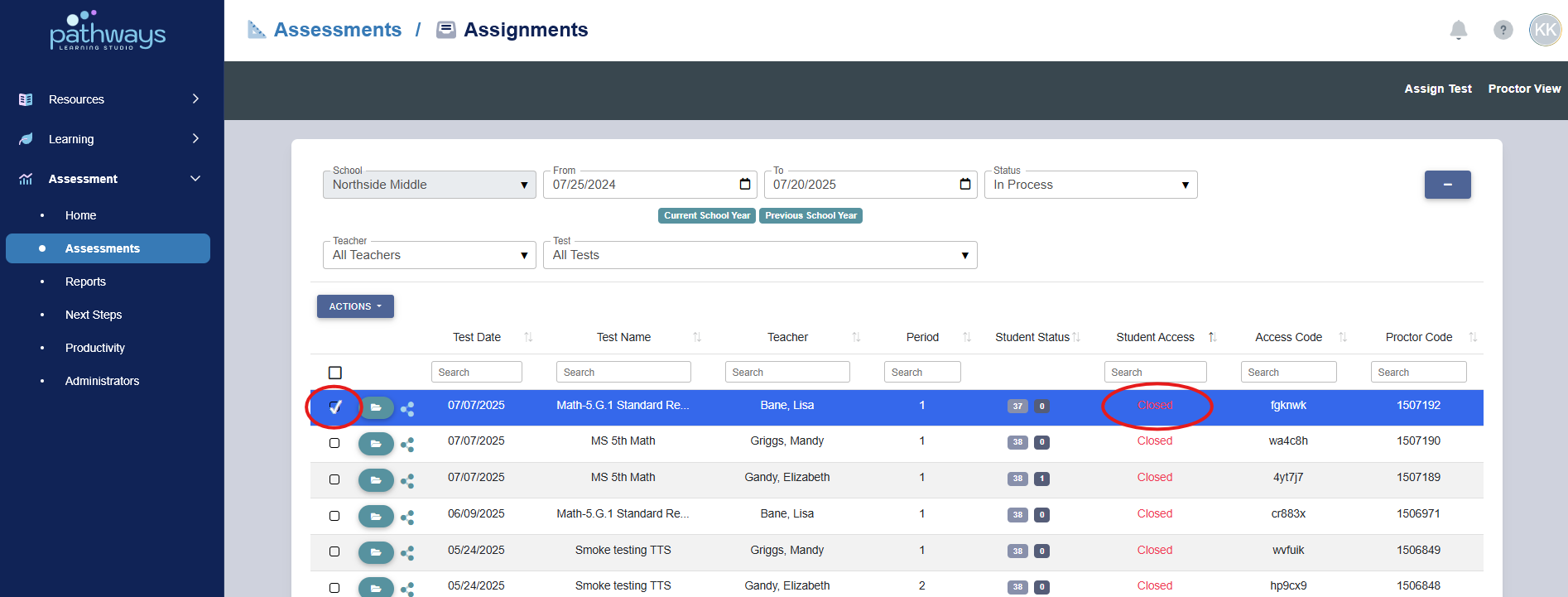 5. Locate the assignment(s) you would like to delete, and select the box(es) to the far left of the assignment(s).