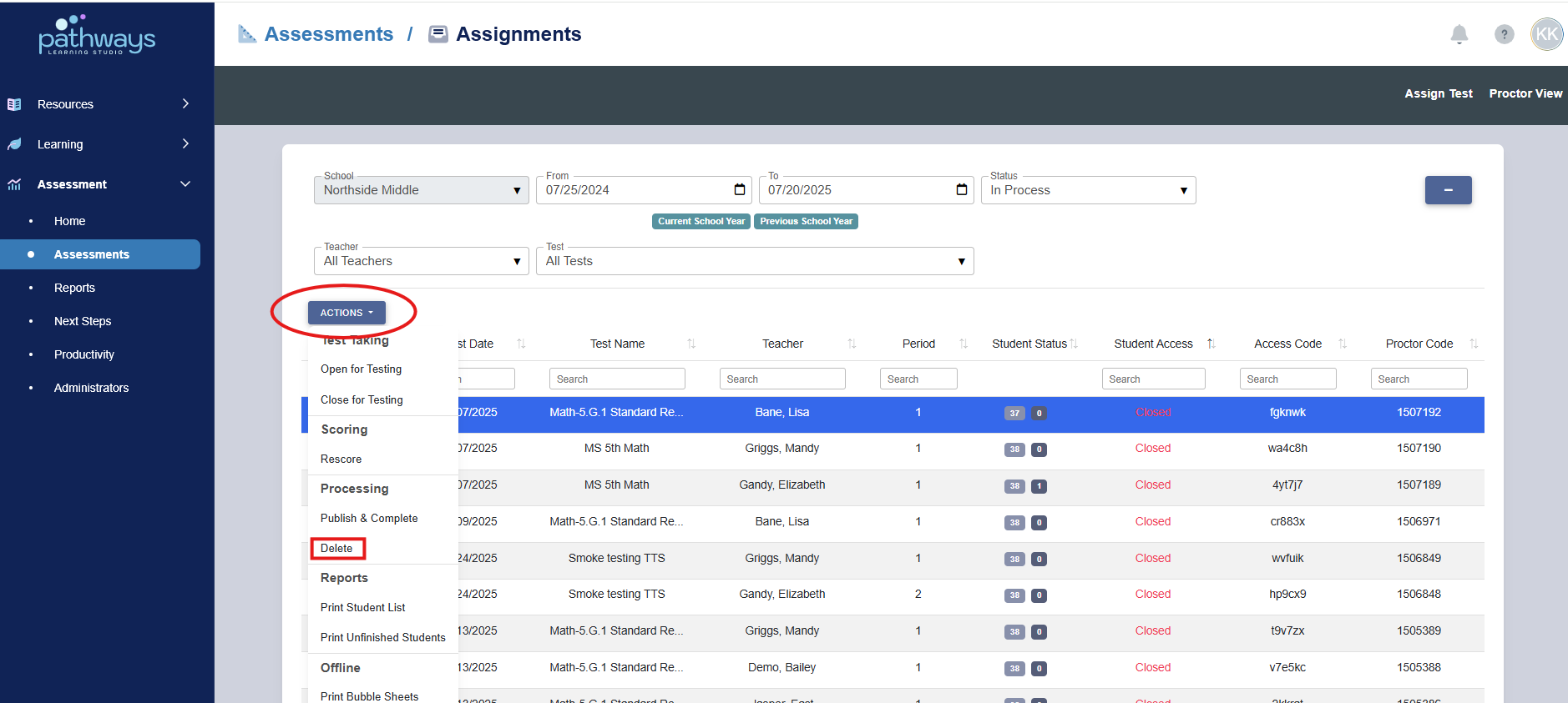 6. Press the ‘Actions’ drop down menu at the top left and choose ‘delete.’ Confirm the intent to delete by typing 'Delete Assignment' into the pop up and click 'Delete Assignment.'