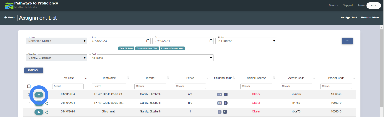 3. Locate the assignment you would like to edit, and select the folder icon to the far left of the assessment name. If the folder icon is not present, this means a district level administrator has made the assessment private.