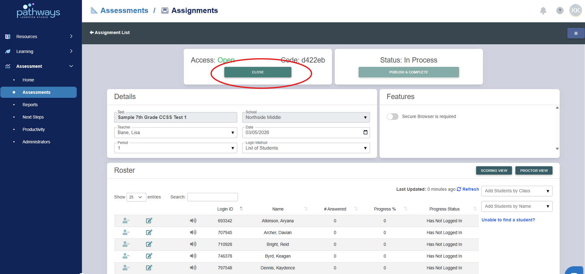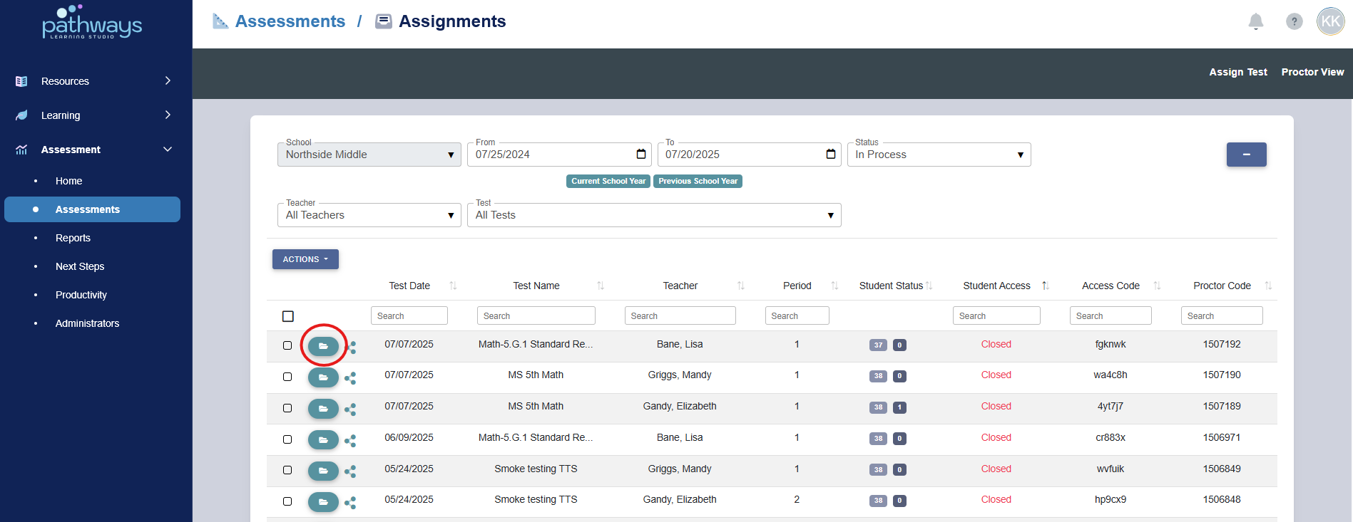5. Locate the assignment you would like to close, and select the folder icon to the far left of the assessment name.