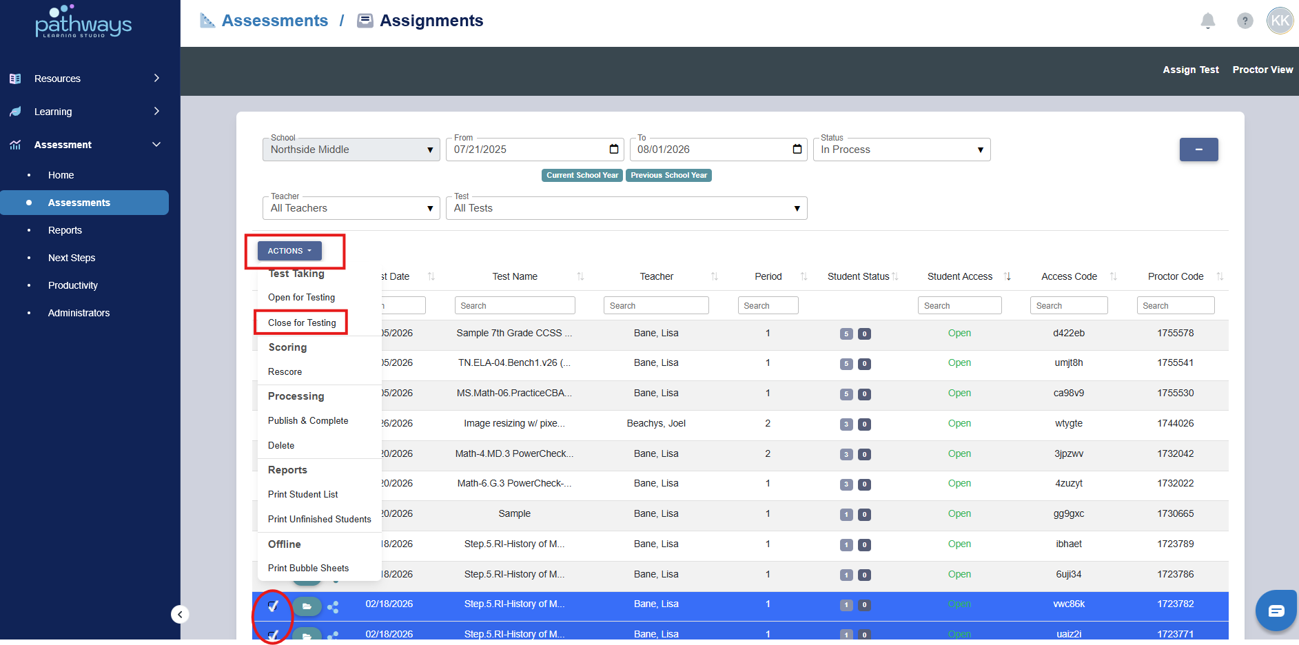 7. Alternatively, from the assignment list page, locate the assignment(s) you would like to close, and select the box(es) to the far left of the assignment(s). Then press the ‘Actions’ drop down at the top left and choose ‘Close for Testing.’