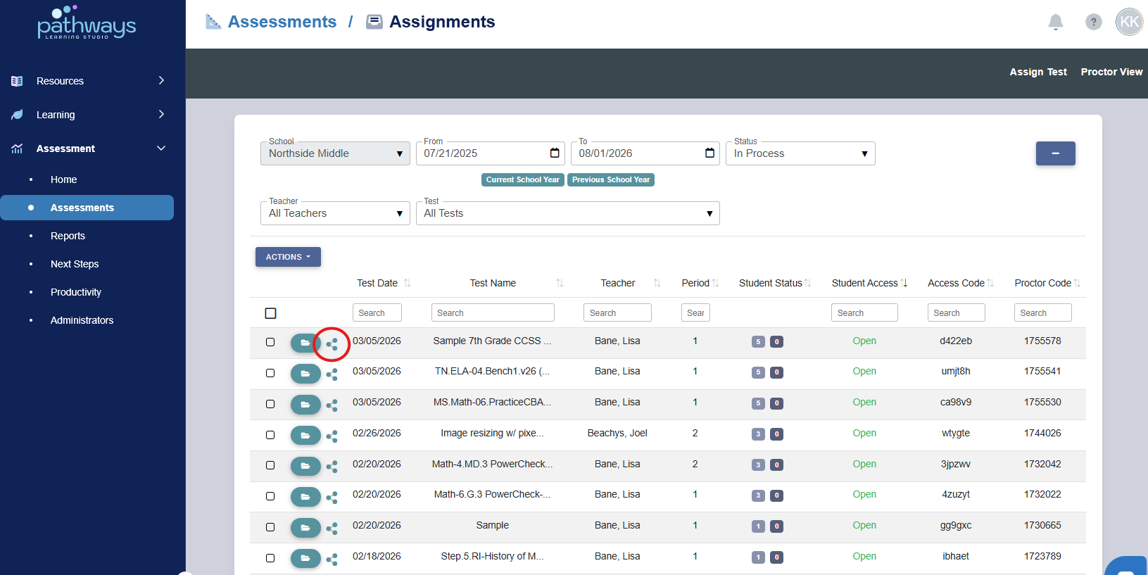 5. Locate the assignment and select the share icon to the left of the assessment date.