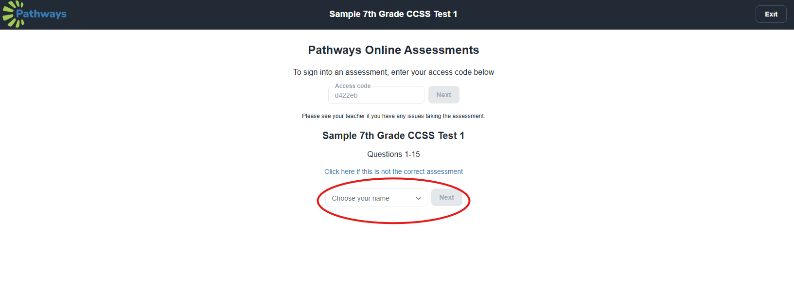 7. Each student will need to choose their name or enter their student ID number (depending on the assignment settings) in the text box at the bottom section of the page. The student will then select 'Next'.