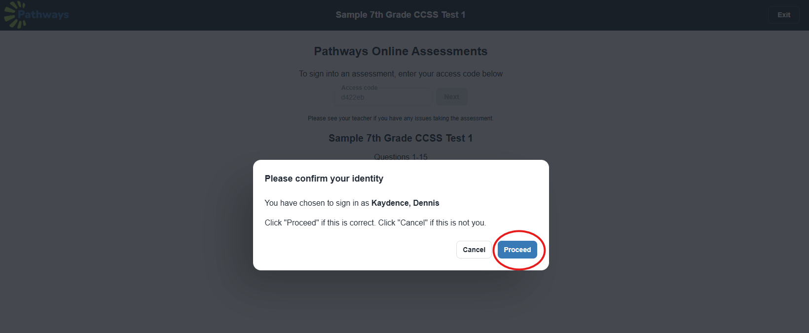 8. Once the student confirms their identity, they will select ‘proceed’ to begin the assessment.