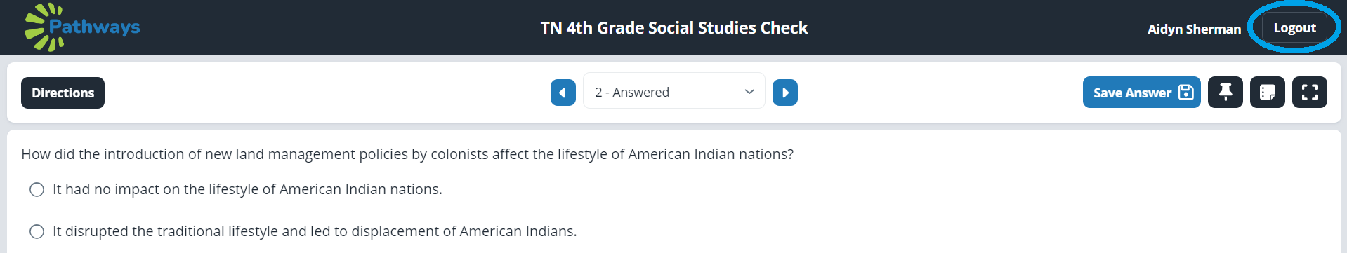 8. The student’s answers will automatically save while navigating through the questions. When the student is finished testing, they will click 'Log Out' in the upper right hand corner. When logging out, they will choose between 'Submit' and 'Save for Later.' If they are done with the assessment, the student should choose 'Submit.' The student will not be able to enter back into the assessment once they have clicked 'Submit.' If the student needs to log out, but they have not finished the assessment, they should choose 'Save for Later.'