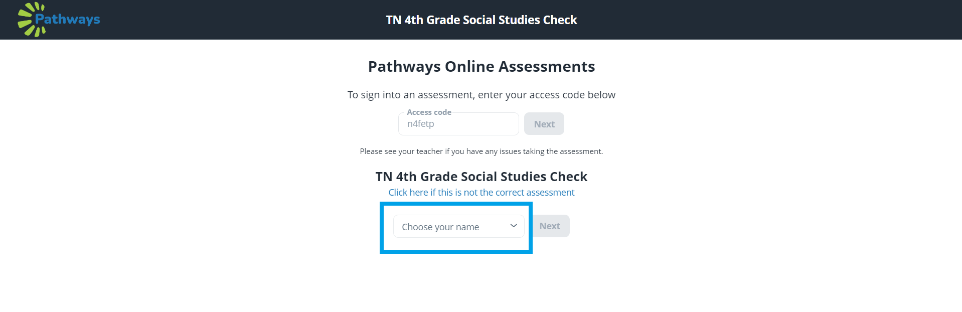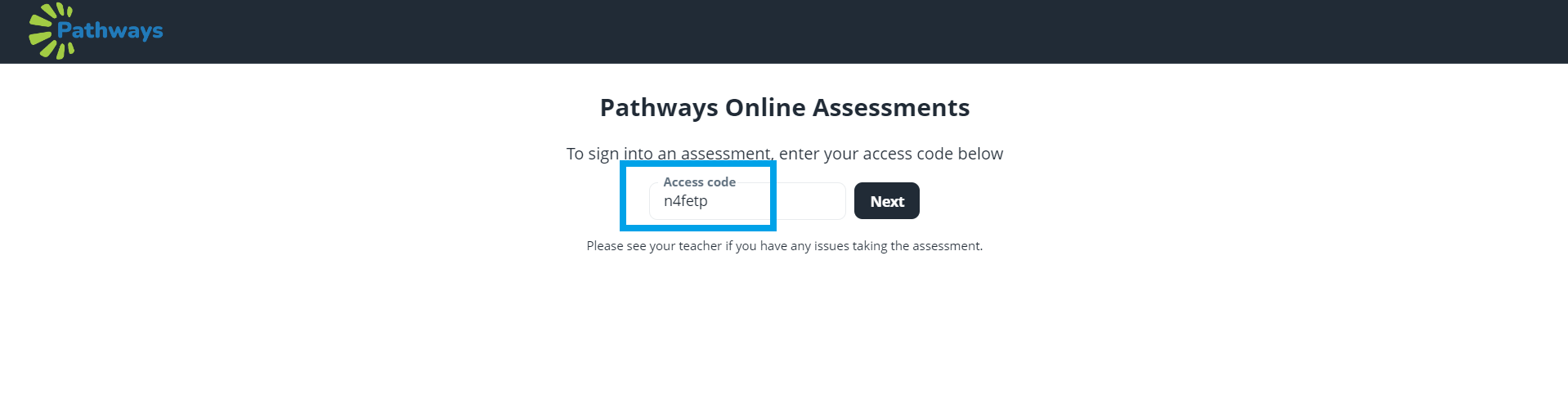 5. Have students go to https://ola.k12pathways.cloud/ and input the assessment code.