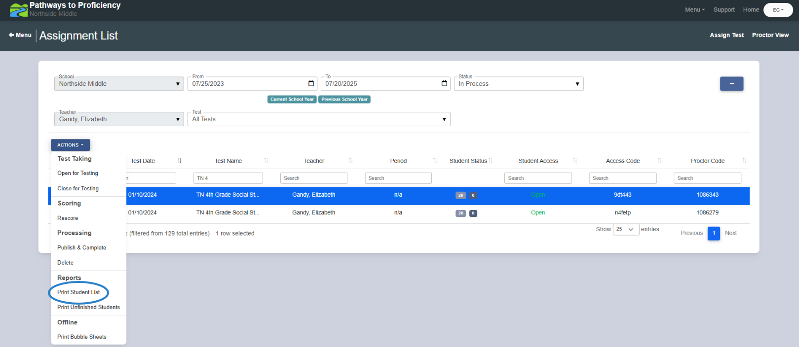 Note: If you wish to print a list of the students included in the assignment, check the box beside the assignment and choose 'Print Student List' from the 'Actions' drop down menu.