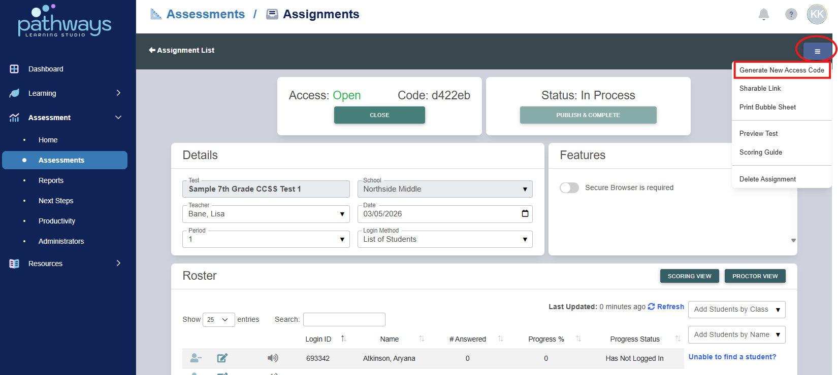This article will explain how users can change the test access code to ensure test security by preventing students from logging back in under a different name.