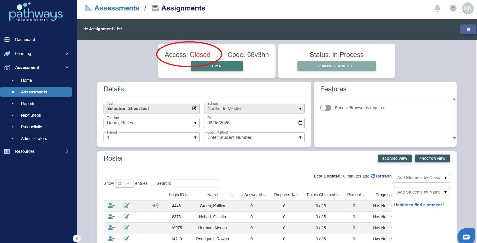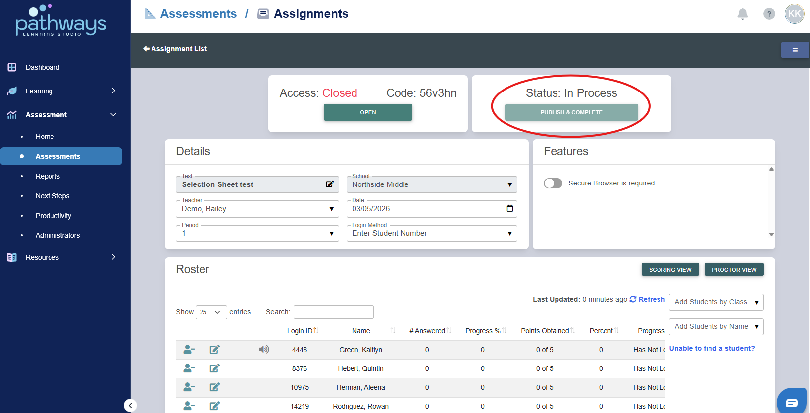 8. When all students have completed the assessment, select the ‘Publish and Complete’ button at the top right of the screen. Once published, the assessment will have score reports and student reviews available.