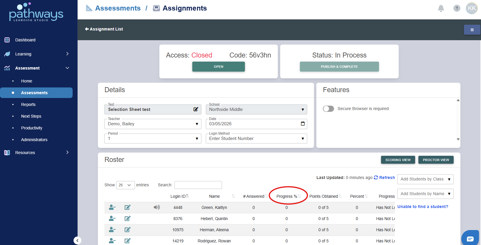7. Check the ‘Progress %’ column to ensure that all students have completed the assessment.