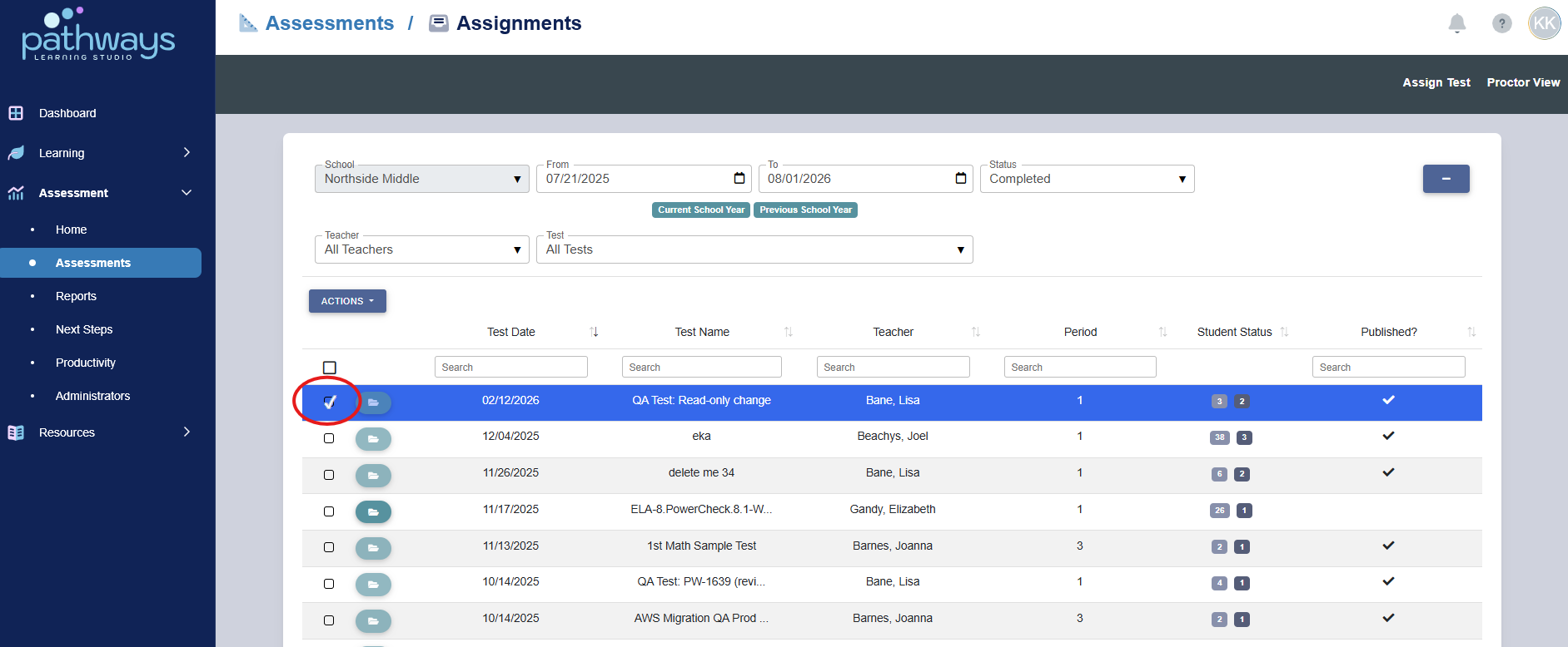 6. Locate the assignment you wish to unpublish, and select the box to the far left of the assignment name.