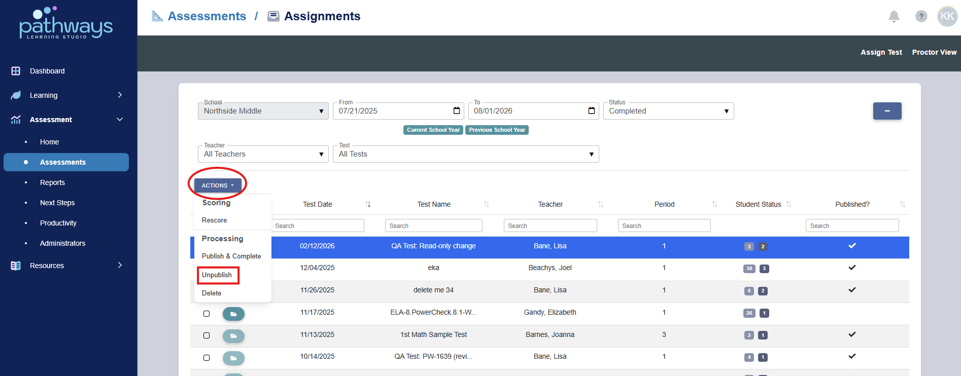 7. Once selected, choose ‘Unpublish’ from the 'Action' menu.