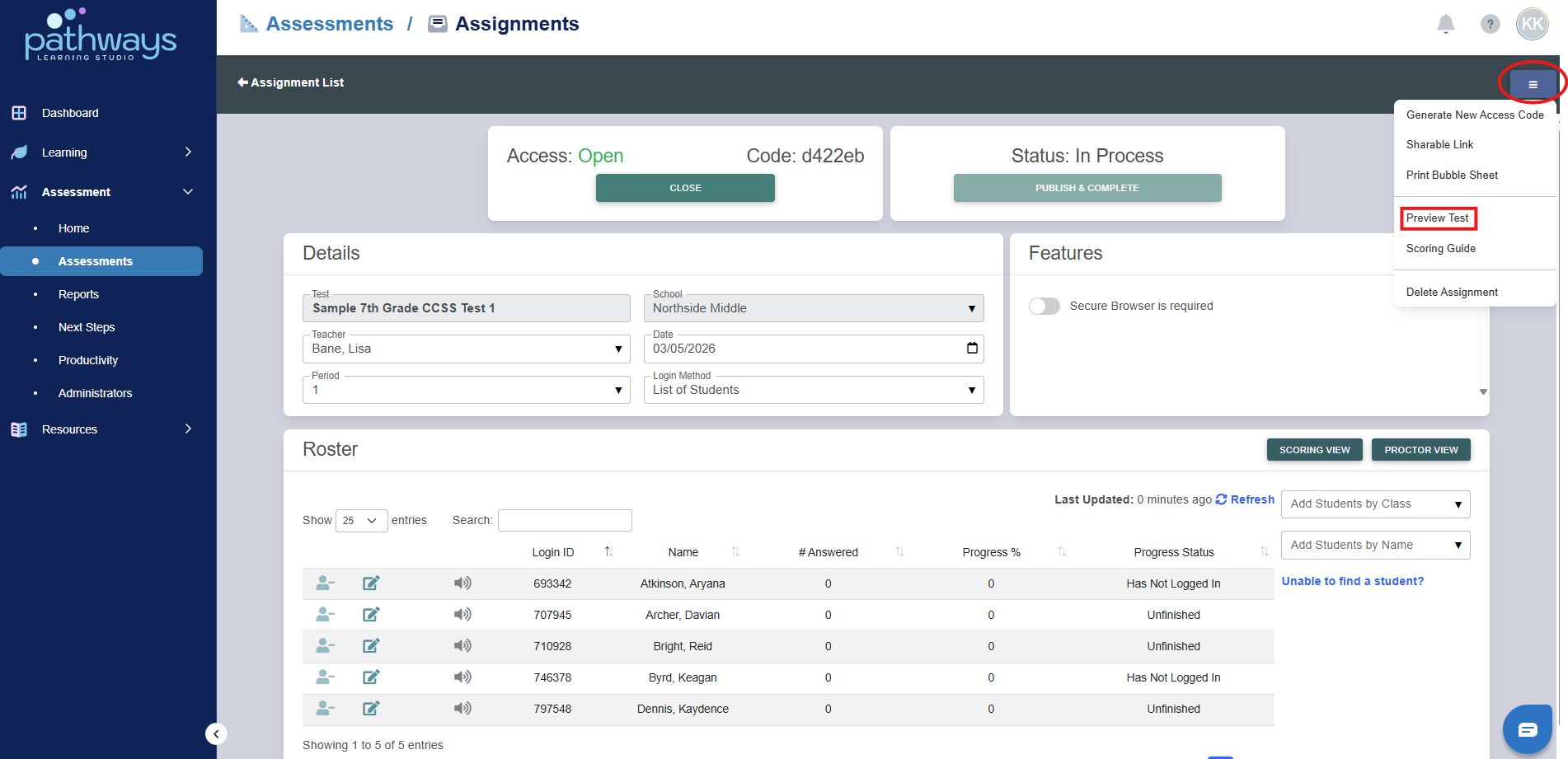 4. Select the collapsed menu at the top right of the screen, and select ‘Preview Test.’