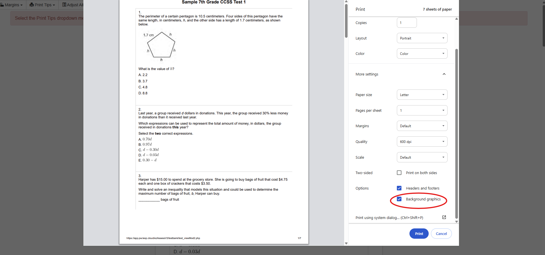 6. Before printing, ensure that the ‘Background Graphics’ option is selected under the ‘More Settings’ section.