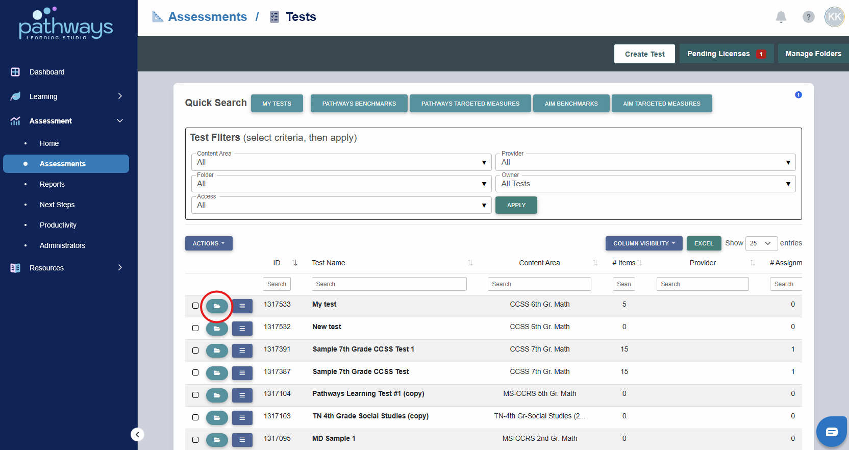6. Locate the assessment and select the folder icon to the left of the assessment ID.