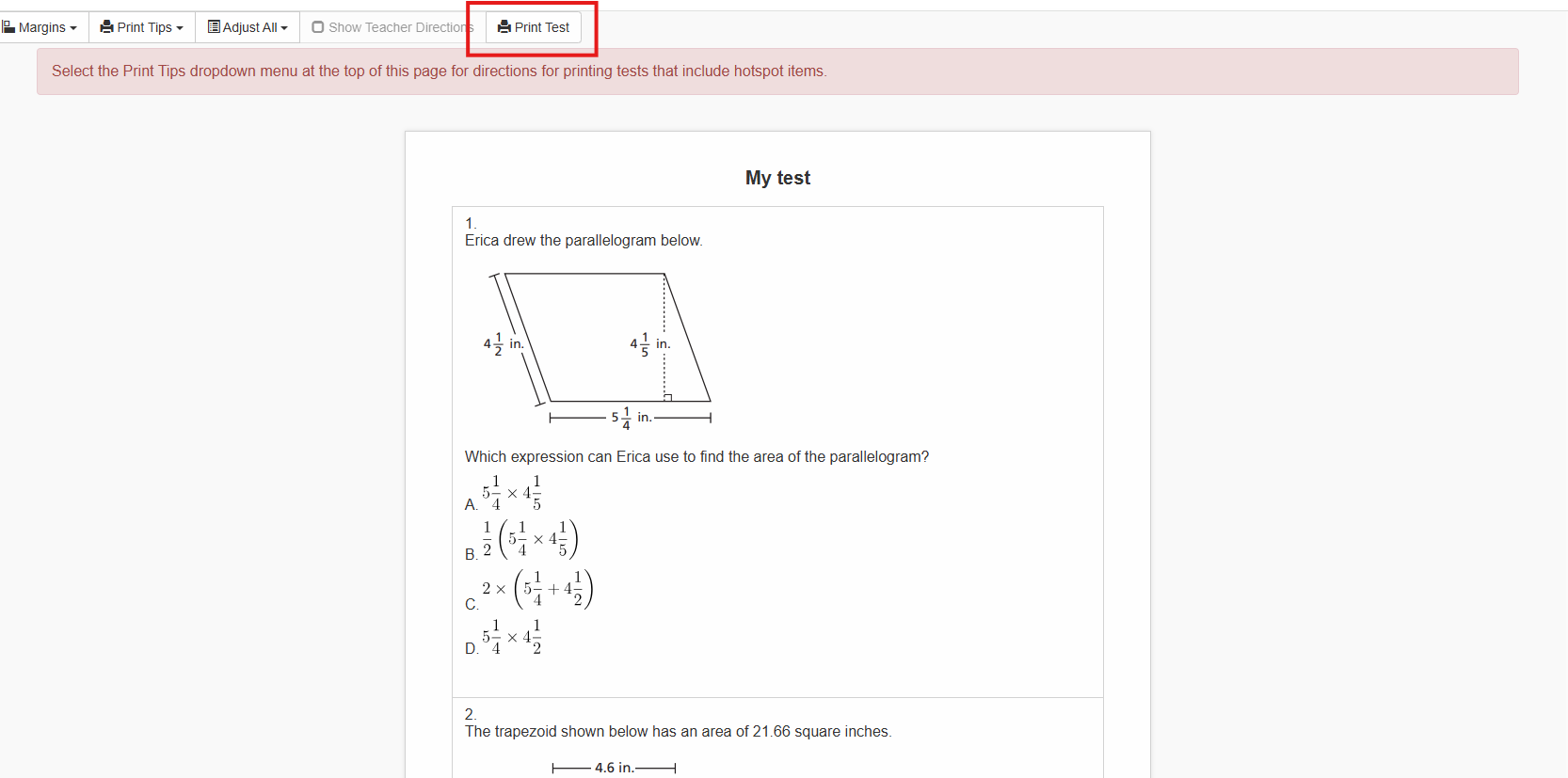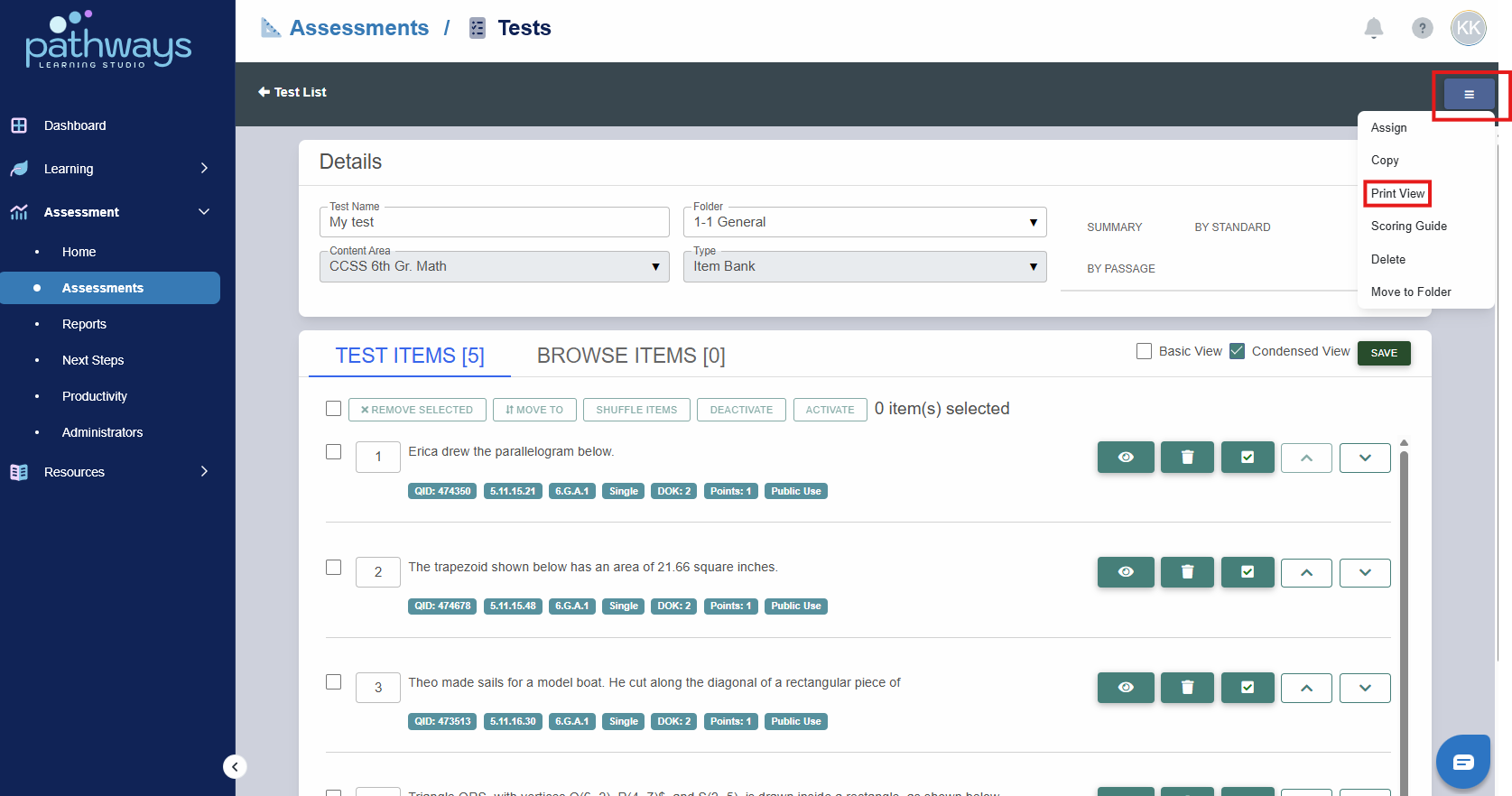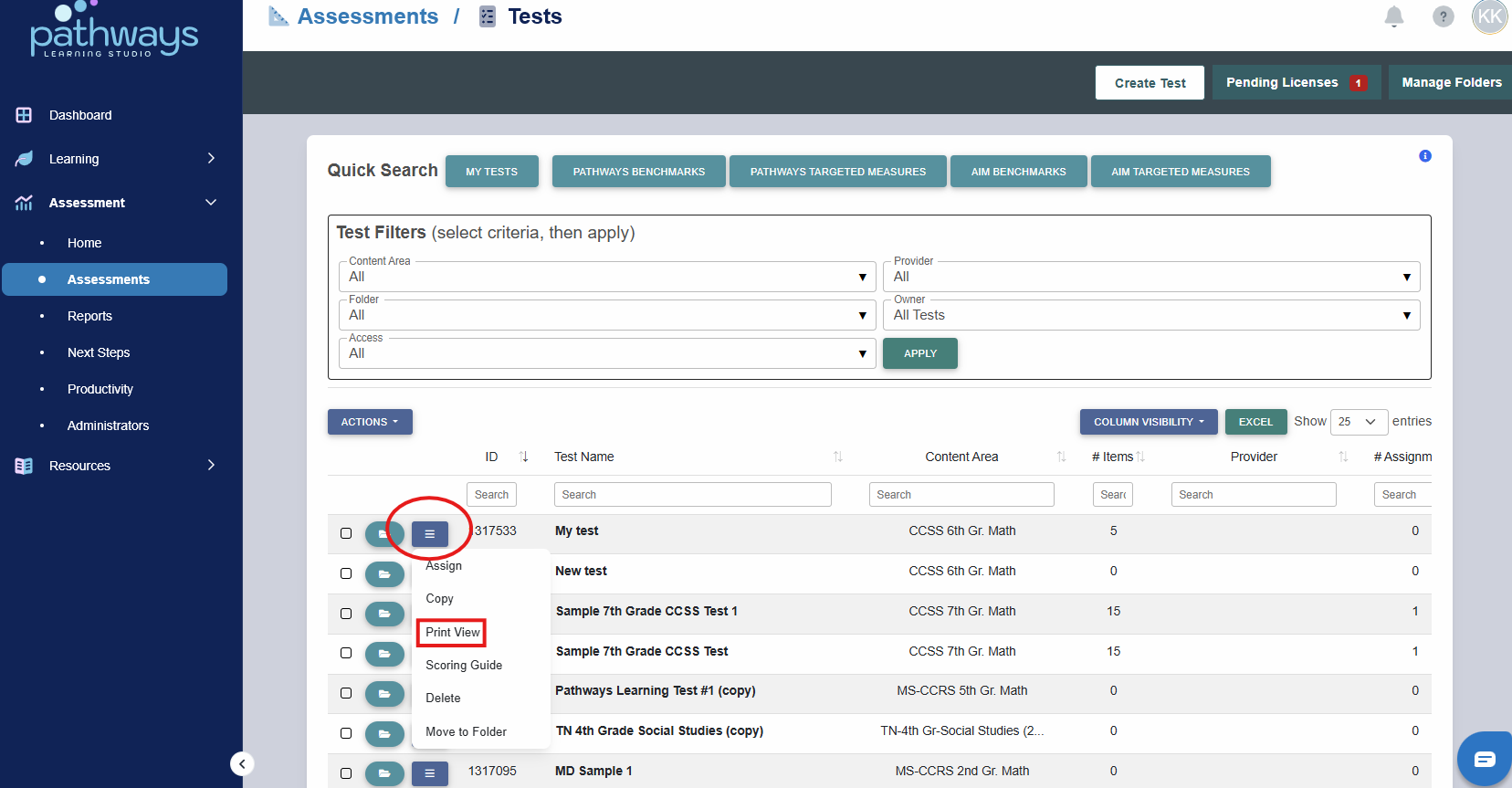 Note: It is also possible to print an assessment from the assessment list by selecting 'Print View' from the collapsed menu between the folder icon and the Test ID/Name.
