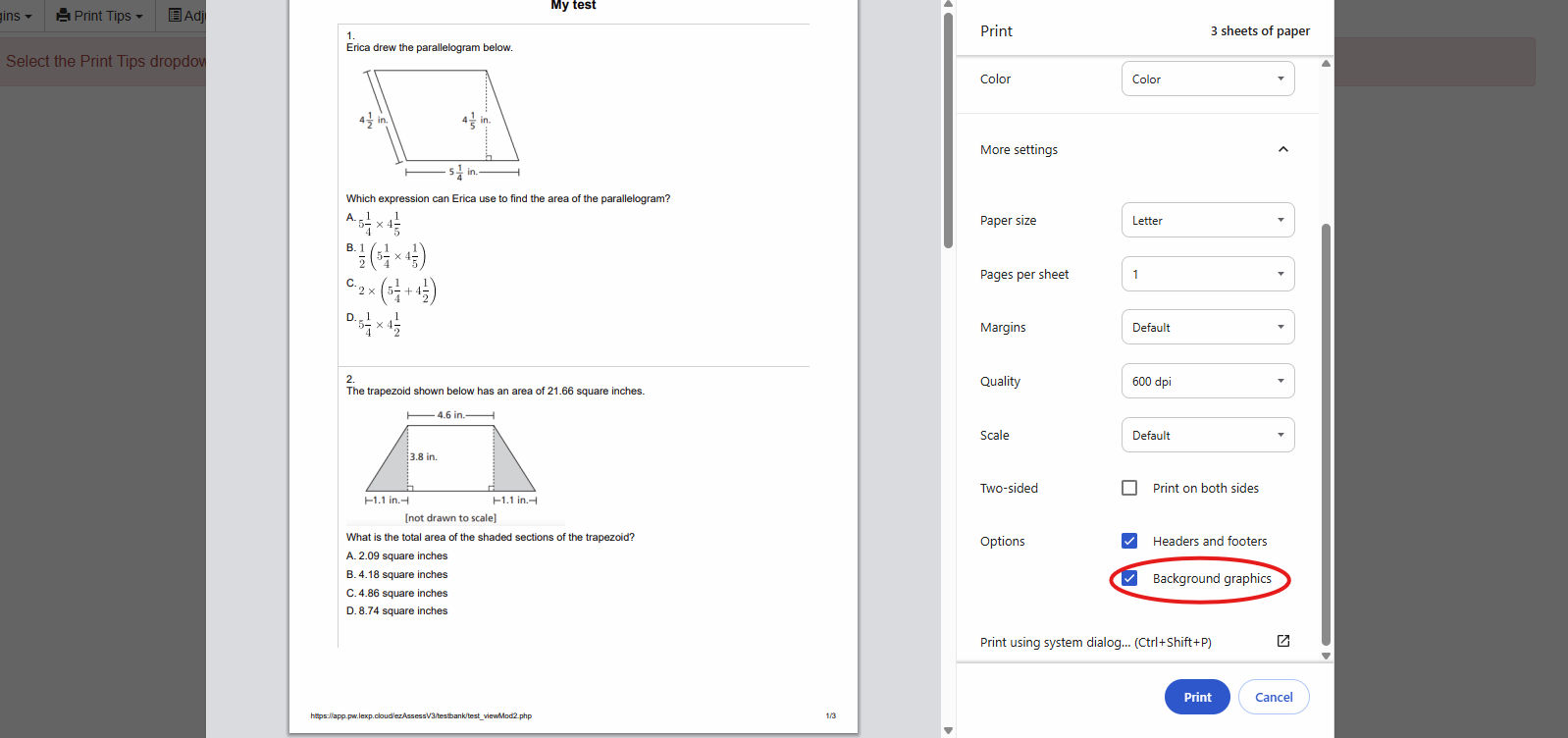 9. Before printing, ensure that the ‘Background Graphics’ option is selected under the ‘More Settings’ section.