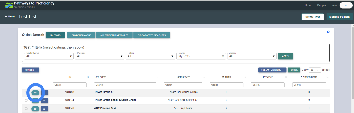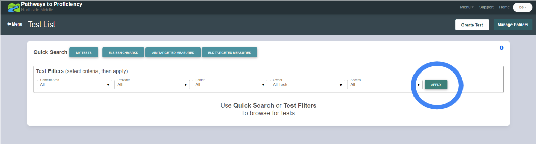 2. Navigate to Pathways to Proficiency -> Measures -> Tests -> Apply.