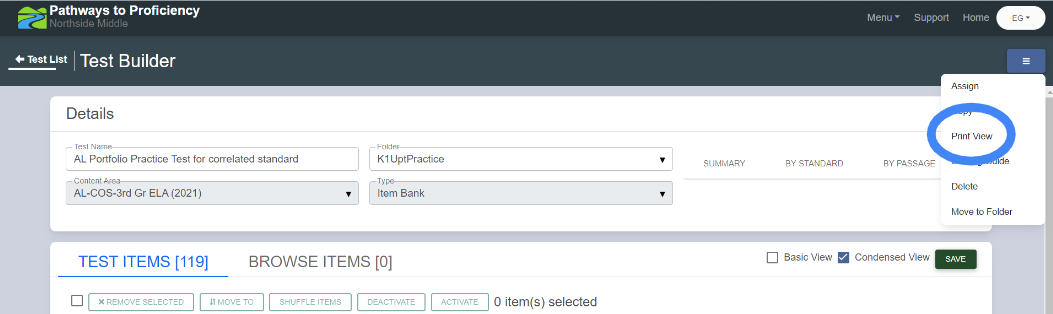 NOTE: It is also possible to print an assessment from the assessment list by selecting 'Print View' from the the blue menu button between the folder icon and the Test ID/Name.