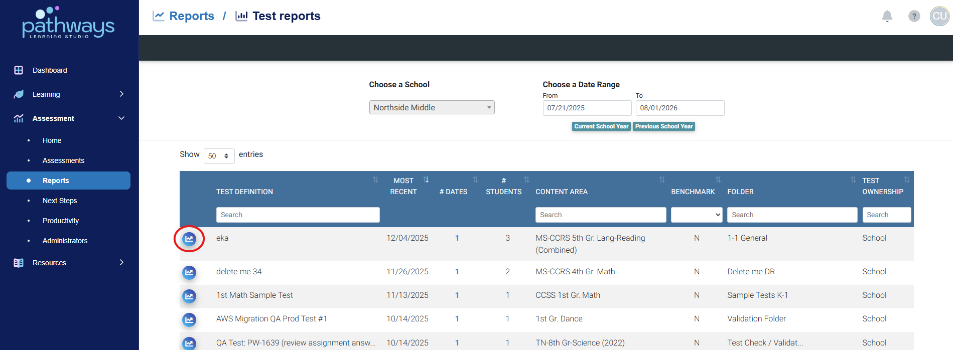 5. Locate the assessment for which you wish to view a report, and select the graph icon to the left of the assessment name.