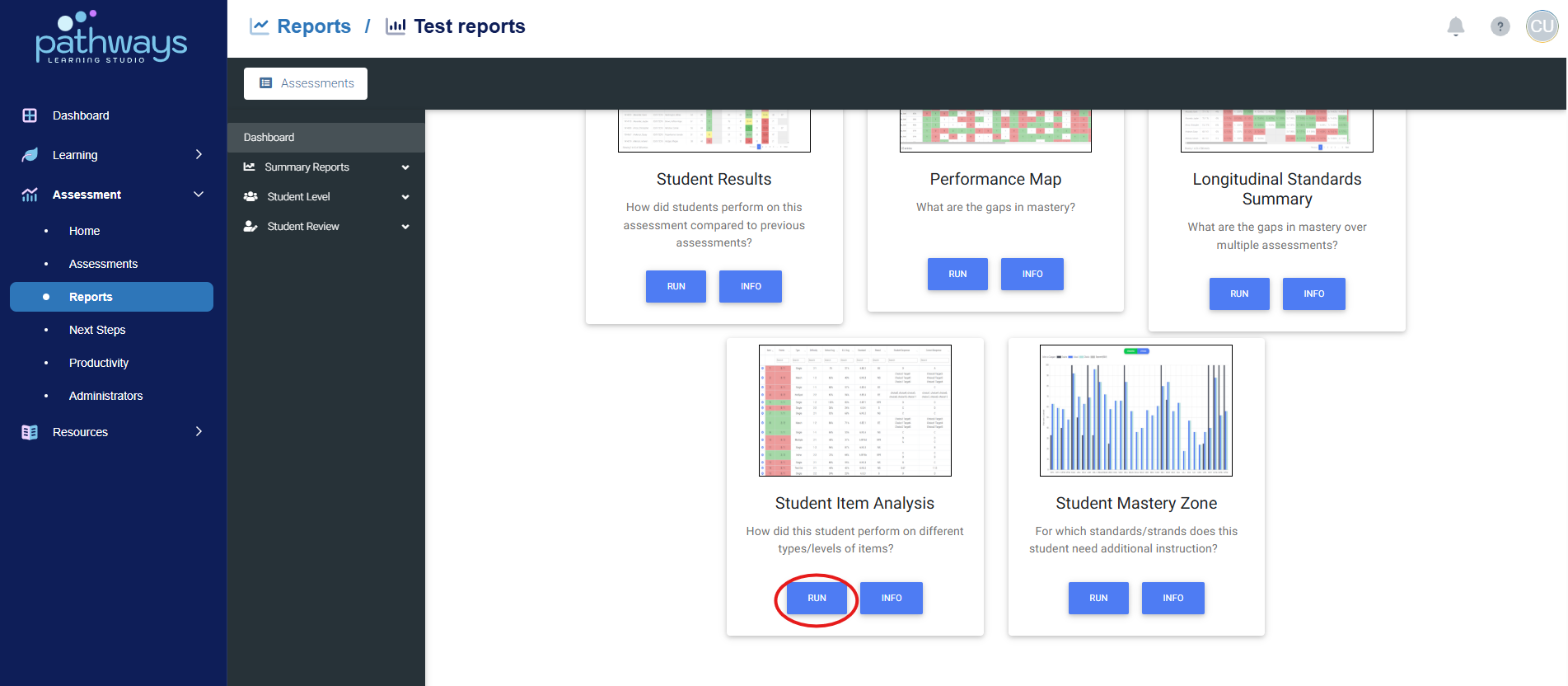 6. Find the ‘Student Item Analysis’ box, and select ‘Run.’