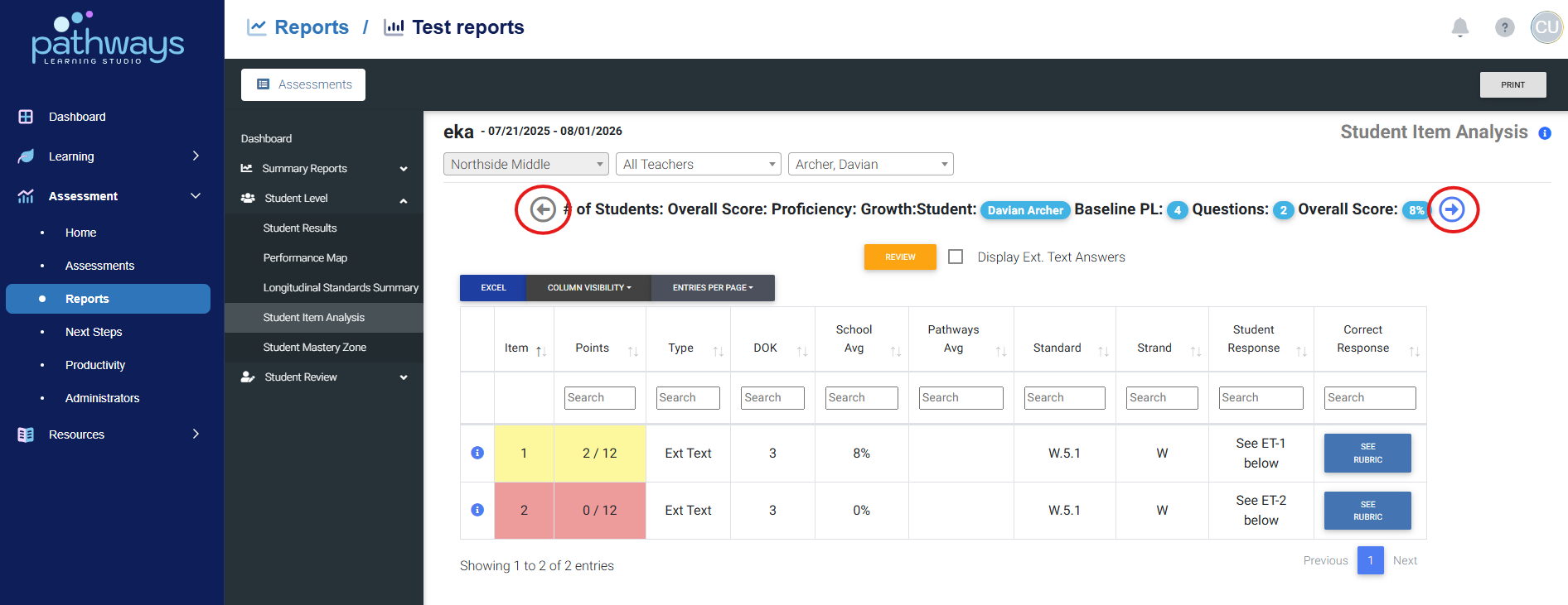 7. Navigate to the student for which you wish to create an individualized review using the arrows at the top of the screen.