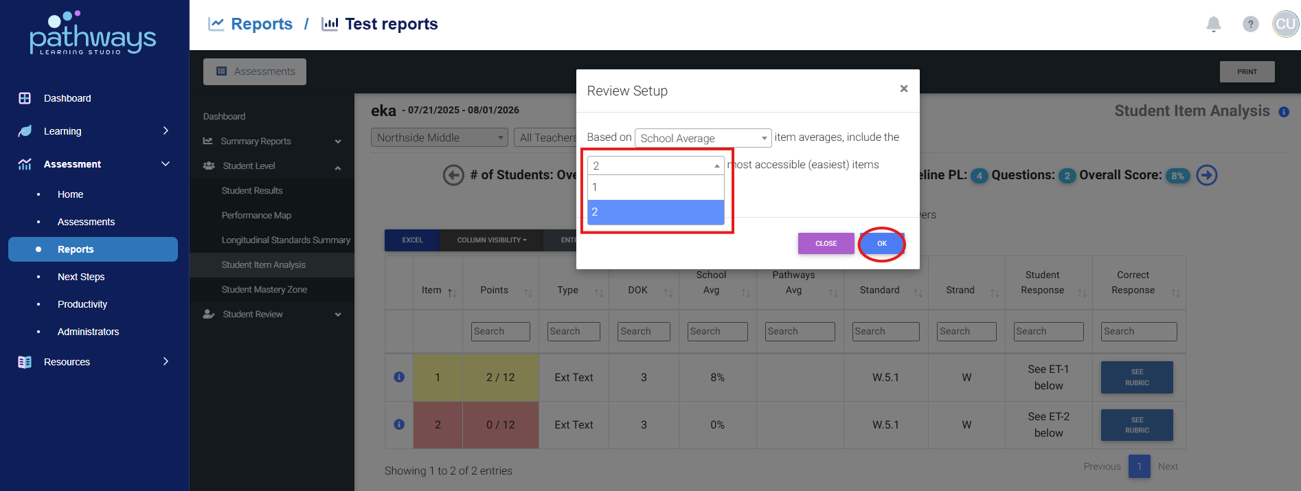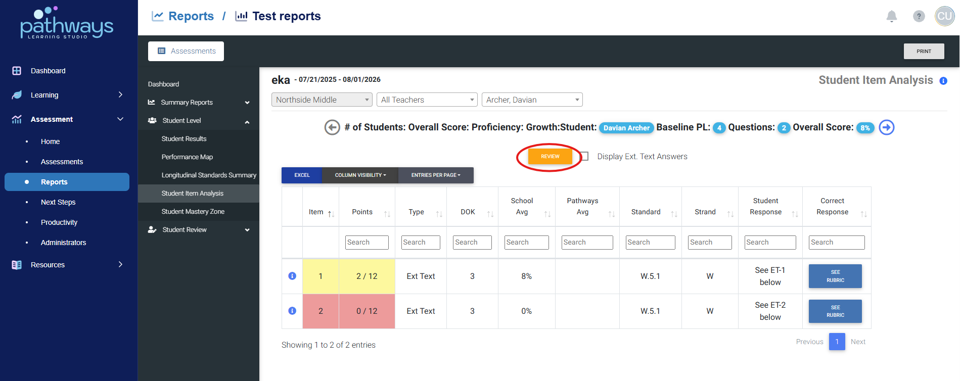 There are two ways to create student reviews after a student has completed an assessment: from the Item Analysis assessment report and from the Analysis and Growth Dashboard. This article will explain how to create a review from the Item Analysis assessment report. This method only allows a teacher to print one individualized worksheet at a time. To print individualized worksheets or create individualized online assessments for an entire classroom, create the reviews from the Analysis and Growth Dashboard.