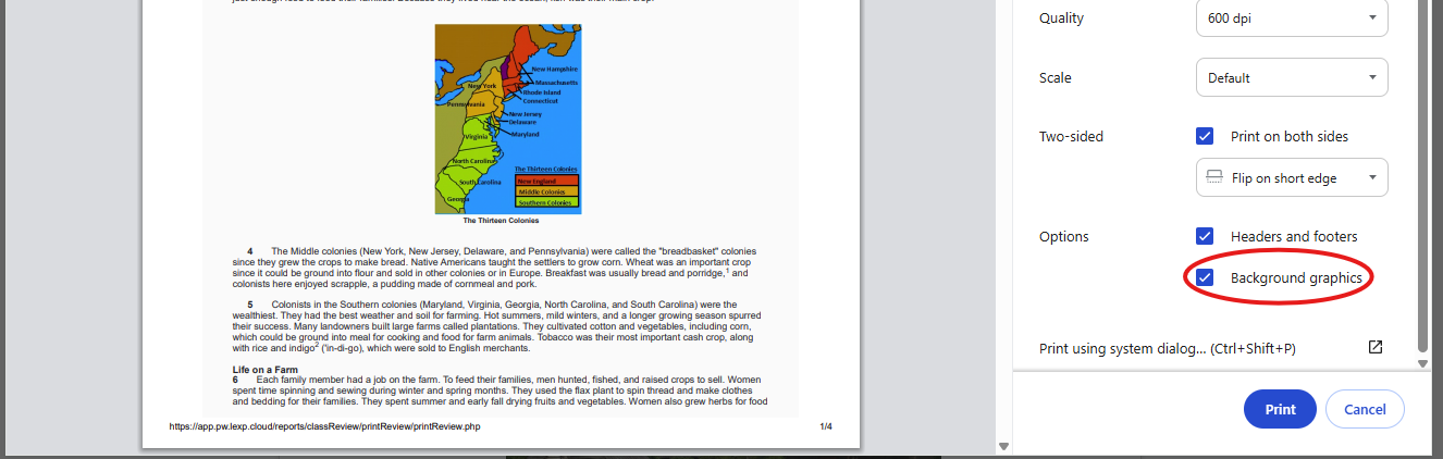 10. Under ‘More Settings’ ensure that ‘Background Graphics’ is on, then select ‘Print.’