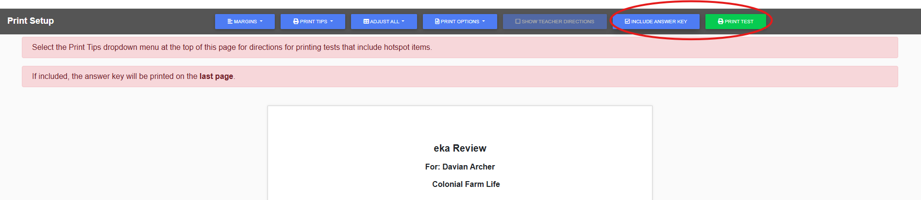 9. Choose whether or not you would like to include the answer key in the top right corner, then select ‘Print Test.’