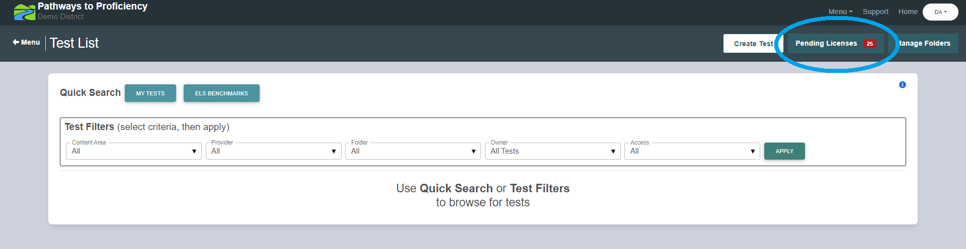 3. If there are tests ready for activation, you will see ‘Pending Tests’ along with a red number in the upper right corner of the page.