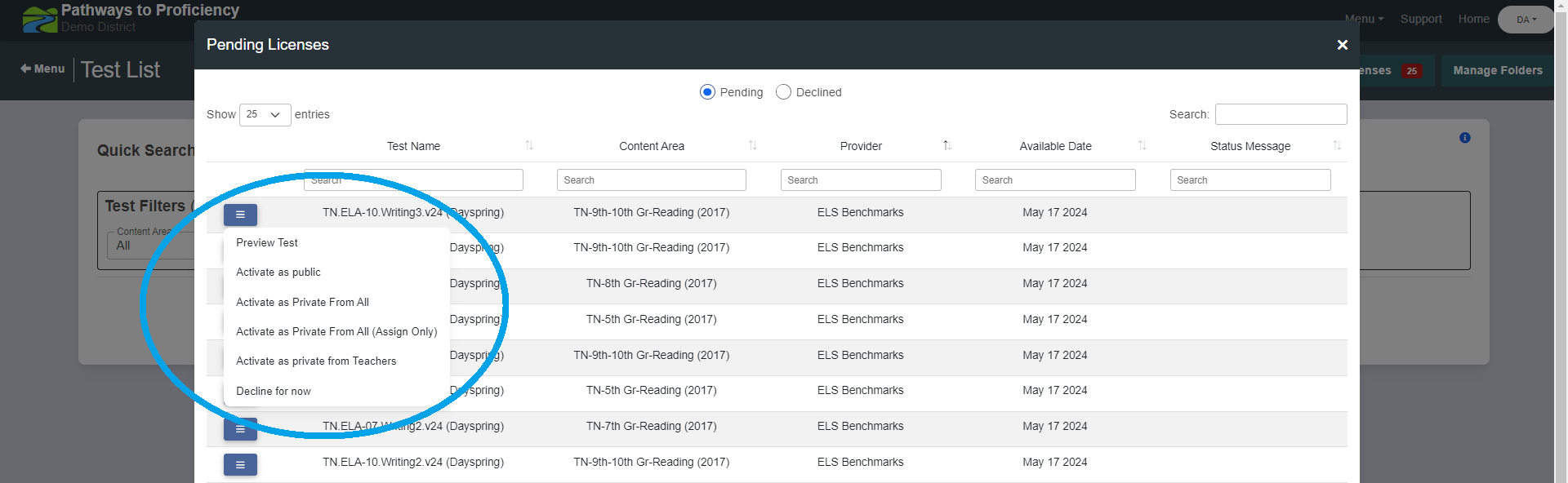 4. By clicking on 'Pending,' district-level administrator can access all the Benchmark assessments that are available at that moment, but have yet to be activated. The district level user can review the assessment by clicking the three blue lines to the left of the test name. After previewing, the administrator can decide the status to assign to the assessment (Private from All, Private from Teachers, Private from All (Assign Only), or Public). To learn more about the privacy levels, see Understanding Assessment Privacy Levels.